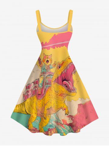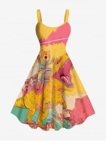 Plus Size Cat Dinosaur Cloud Colorblock Print Hawaii Tank Dress - Yellow - 3x