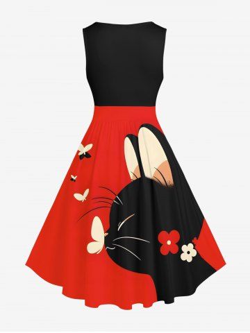 Plus Size Cat Floral Butterfly Print Vintage Swing A Line Dress - Red - 5x