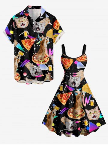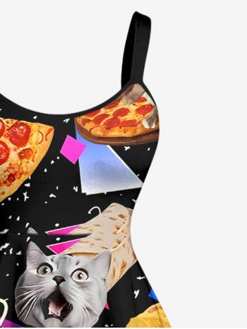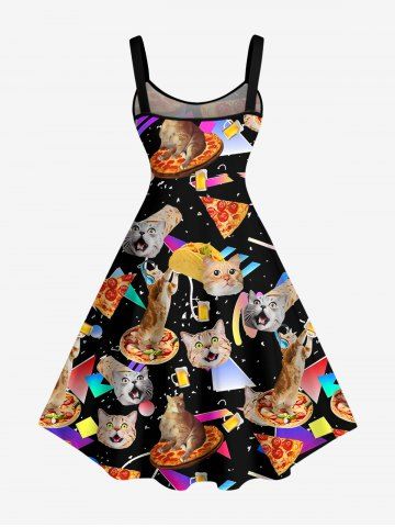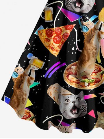Plus Size Cat Pizza Rolled Pancake Geometric Graphic Print Hawaii A Line Dress - Black - Xxs