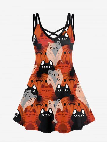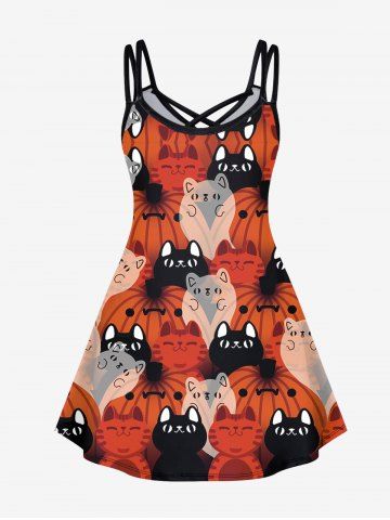 Graphic Dresses > Plus Size Cat Pumpkin Print Crisscross Cami Dress