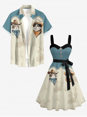 Graphic Dresses > Plus Size Cats Flowers Cactus Print Buttons Turn Down Collar Hawaii Dress With Belt