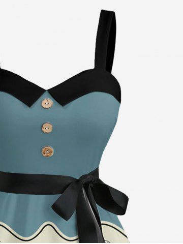 Plus Size Cats Flowers Cactus Print Buttons Turn Down Collar Hawaii Dress With Belt - Blue - M