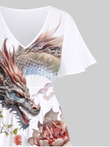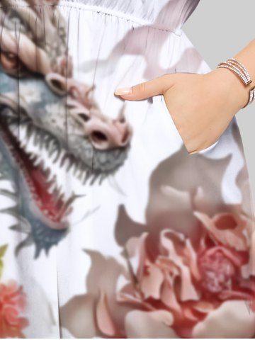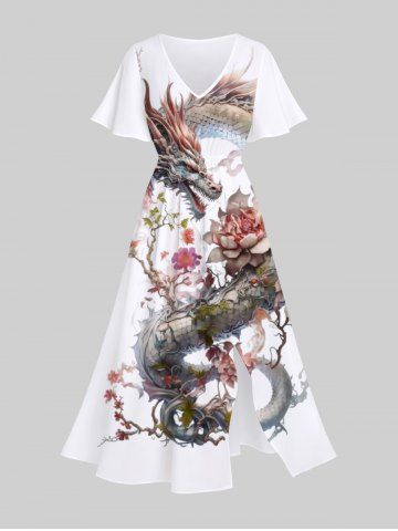 Plus Size Chinese Elements Dragon Flowers Print Split Midi Dress - White - 1x