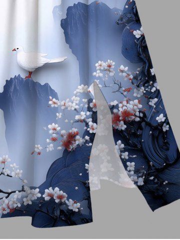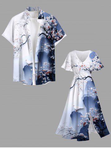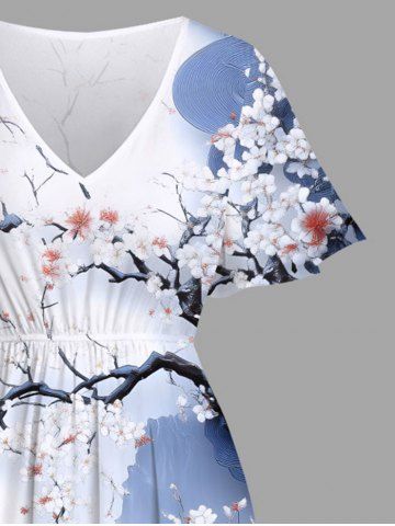 Plus Size Chinese Style Mountain Plum Bossom Flowers Print Split Hawaii Midi Dress - Blue - 2x