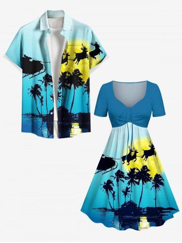Plus Size Christmas Elk Santa Claus Coconut Tree Moon Sea Print Hawaii Cinched A Line Dress - Sky Blue - 4x