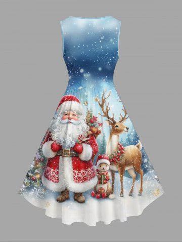 Plus Size Christmas Tree Santa Claus Elk Snowflake Print 1950s Vintage Dress - Blue - 4x