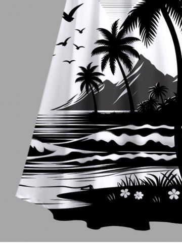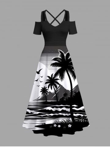 Plus Size Coconut Tree Bird Seascape Print Cold Shoulder Crisscross Hawaii Maxi Dress - Black - S
