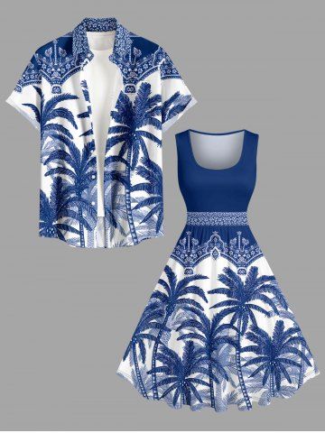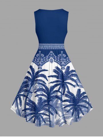 Plus Size Coconut Tree Blue and White Porcelain Style Print Hawaii Swing A Line Dress - Deep Blue - Xxs