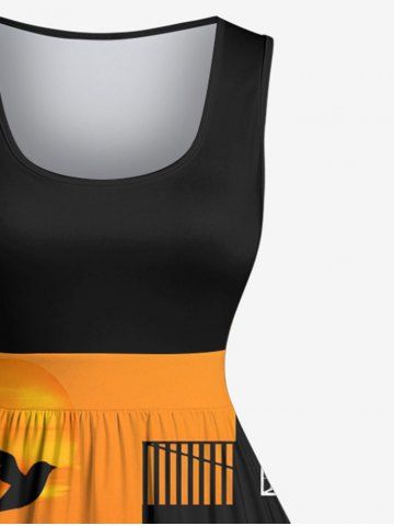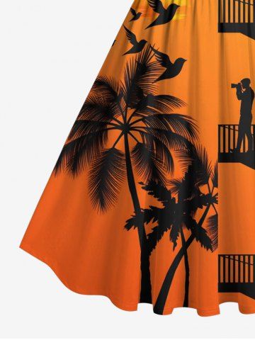 Plus Size Coconut Tree Building Bird Print Hawaii Vintage Swing A Line Dress - Orange - Xs
