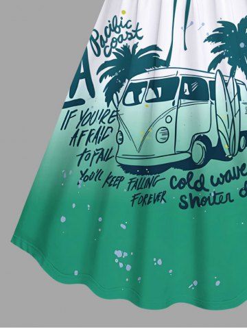 Plus Size Coconut Tree Bus Letters Print Hawaii Ombre Cinched A Line Dress - Green - L