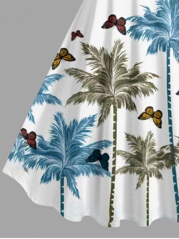Plus Size Coconut Tree Butterfly Print Hawaii A Line Dress - White - M