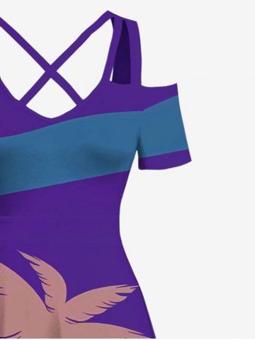 Plus Size Coconut Tree Car Geometric Colorblock Print Hawaii Cold Shoulder Crisscross A Line Maxi Dress - Purple - M
