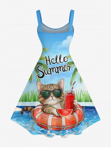 Graphic Dresses > Plus Size Coconut Tree Cat Swimming Ring Letters Print Hawaii A Line Dress