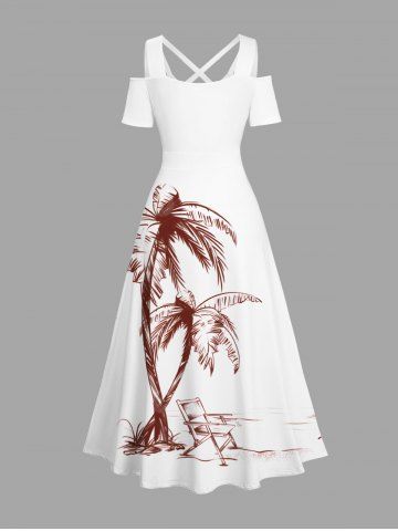Plus Size Coconut Tree Chair Print Cold Shoulder Crisscross Hawaii Maxi Dress - White - S