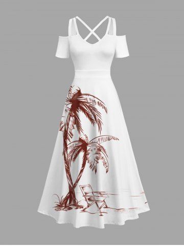 Plus Size Coconut Tree Chair Print Cold Shoulder Crisscross Hawaii Maxi Dress - White - 1x