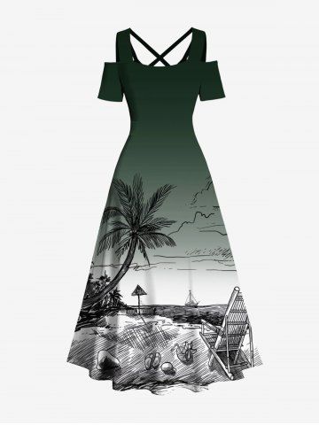 Graphic Dresses > Plus Size Coconut Tree Chairs Boat Cloud Seascape Print Cold Shoulder Crisscross Hawaii Maxi Dress