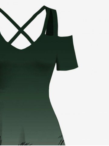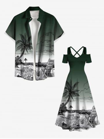 Plus Size Coconut Tree Chairs Boat Cloud Seascape Print Cold Shoulder Crisscross Hawaii Maxi Dress - Black - L