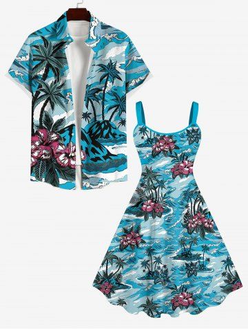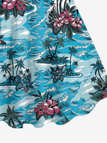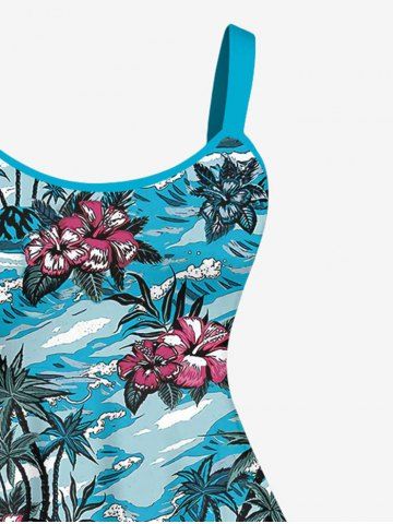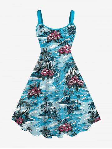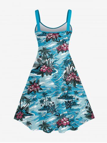 Plus Size Coconut Tree Cloud Flower Leaf Print Hawaii Tank Dress - Light Blue - Xs