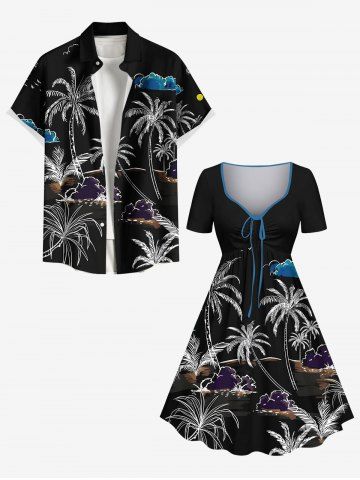 Plus Size Coconut Tree Cloud Moon Bird Print Cinched Hawaii Dress - Black - 1x