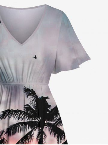 Plus Size Coconut Tree Cloud Ombre Dusk Print Hawaii Split Pocket A Line Midi Dress - Light Pink - M