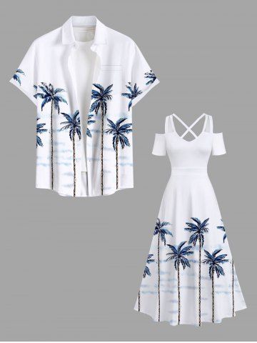 Plus Size Coconut Tree Cloud Print Cold Shoulder Crisscross Hawaii Maxi Dress - White - 3x