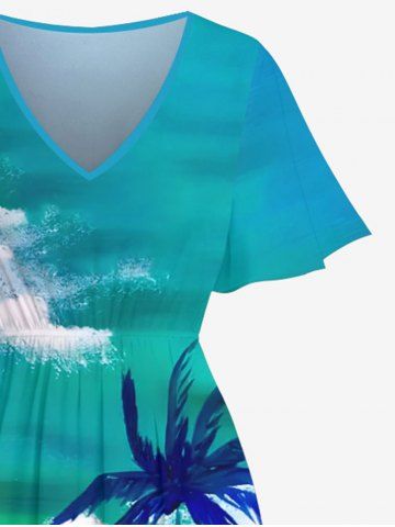 Plus Size Coconut Tree Cloud Sea Ombre Sky Print Split Hawaii Midi Dress - Green - 2x