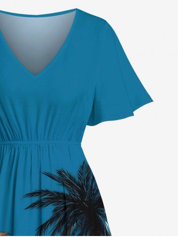 Plus Size Coconut Tree Cloud Sky Beach Car Print Hawaii Split Pocket A Line Midi Dress - Blue - 4x