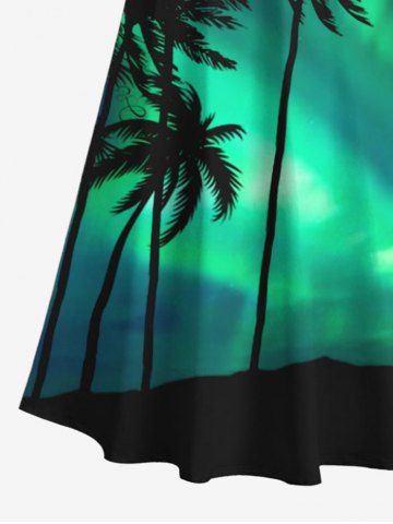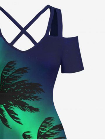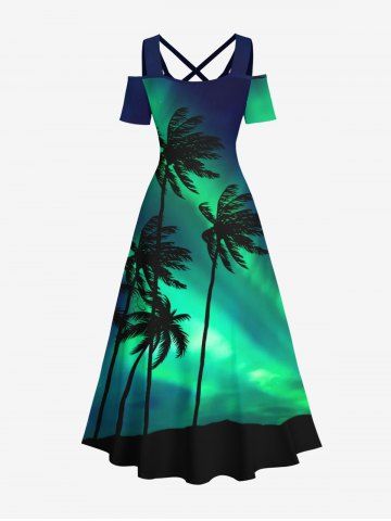 Graphic Dresses > Plus Size Coconut Tree Colorblock Glitter Light Beam 3D Print Cold Shoulder Crisscross Hawaii Maxi Dress