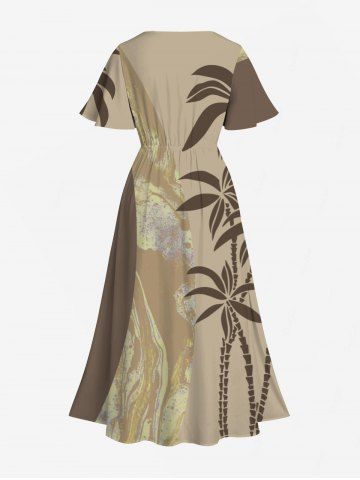 Plus Size Coconut Tree Colorblock Ocean Current Print Split Hawaii Midi Dress - Coffee - 1x