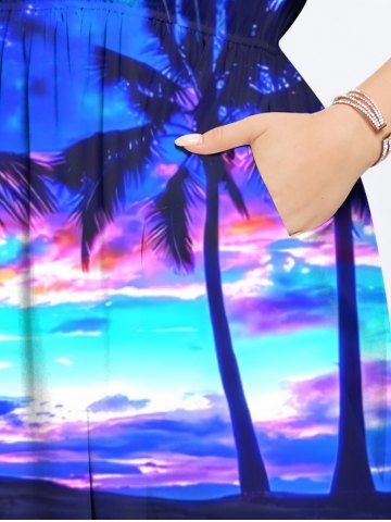Plus Size Coconut Tree Colorful Cloud Seascape Print Split Hawaii Midi Dress - Blue - 3x