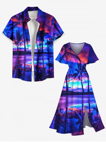 Graphic Dresses > Plus Size Coconut Tree Colorful Cloud Seascape Print Split Hawaii Midi Dress