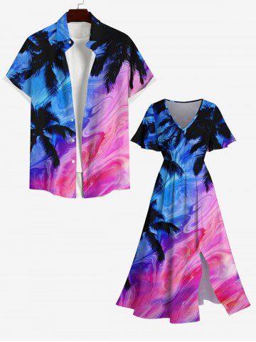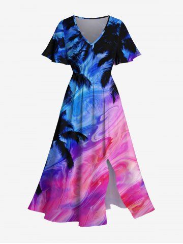 Plus Size Coconut Tree Colorful Ombre Quicksand Print Hawaii Split Pocket A Line Midi Dress - Multi-a - 3x
