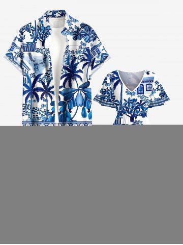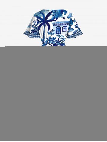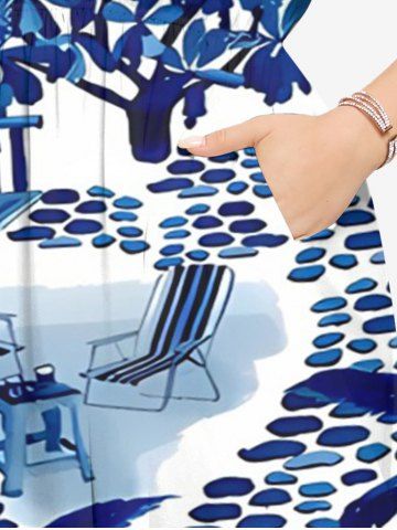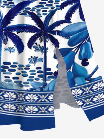 Plus Size Coconut Tree Courtyard Path Blue and White Porcelain Style Print Hawaii Split Pocket A Line Midi Dress - Blue - S