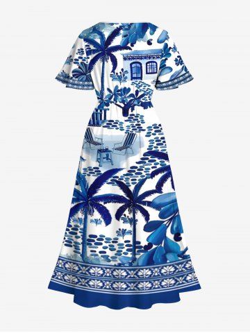 Plus Size Coconut Tree Courtyard Path Blue and White Porcelain Style Print Hawaii Split Pocket A Line Midi Dress - Blue - L