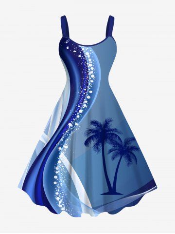 Plus Size Coconut Tree Curve Colorblock Print Hawaii Tank Dress - Blue - 1x