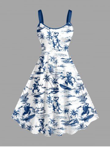 Plus Size Coconut Tree Dinosaur Sea Waves Print Hawaii Tank Dress - Blue - 3x