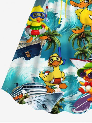 Graphic Dresses > Plus Size Coconut Tree Ducks Ship Sea Waves Print Cinched Hawaii Dress