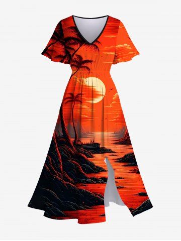 Plus Size Coconut Tree Dusk Sun Mountain Print Split Pocket Hawaii A Line Dress - Red - L