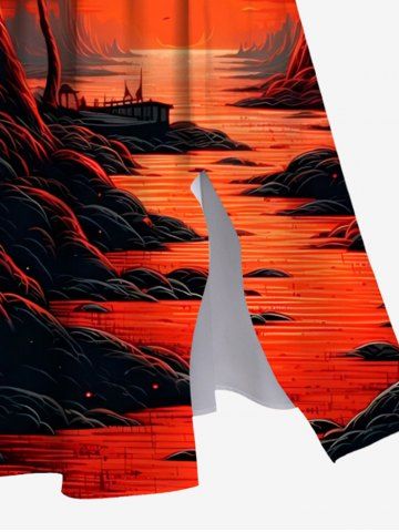 Plus Size Coconut Tree Dusk Sun Mountain Print Split Pocket Hawaii A Line Dress - Red - 5x