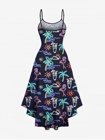 Plus Size Coconut Tree Flamigo Sun Sea Waves Juice Neon Print High Low Hawaii Cami Dress - Black - S