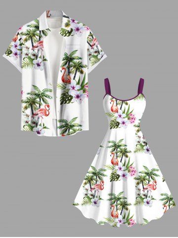 Plus Size Coconut Tree Flamingo Flowers Leaf Print Hawaii Tank Dress - White - S