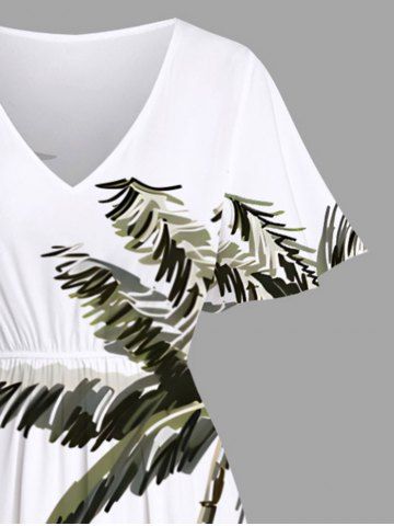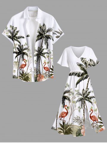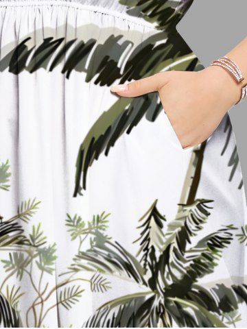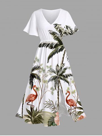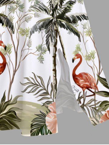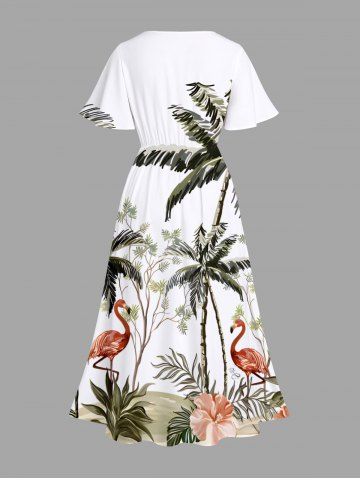 Plus Size Coconut Tree Flamingo Hibiscus Flowers Print Split Hawaii Midi Dress - White - S