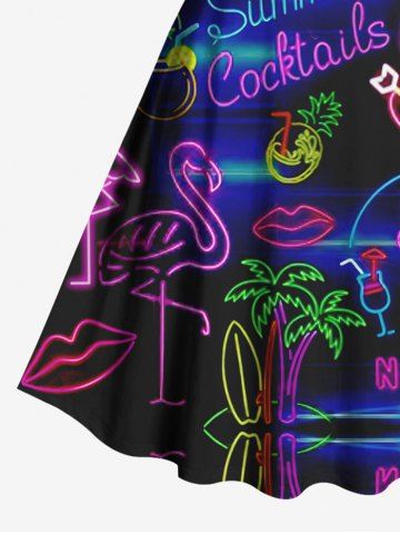 Plus Size Coconut Tree Flamingo Juice Sun Neon Print Vintage Hawaii Dress - Black - S