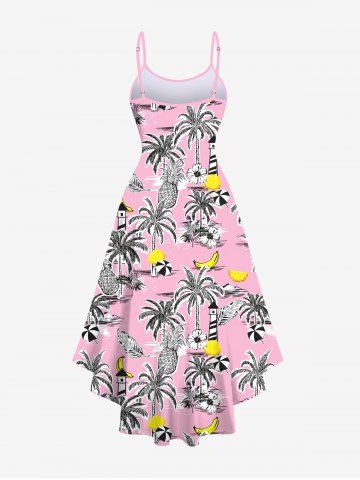 Plus Size Coconut Tree Floral Banana Pineapple Beach Print High Low Asymmetric Hawaii Backless Cami Dress - Light Pink - 3x