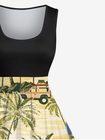 Plus Size Coconut Tree Floral Beach Car Print Hawaii 1950s Vintage Swing A Line Dress - Yellow - 2x