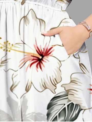 Plus Size Coconut Tree Flower Leaf Print Hawaii Split Pocket A Line Midi Dress - White - L
