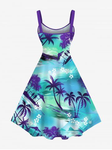 Plus Size Coconut Tree Flower Ombre Seascape Print Hawaii A Line Tank Dress - Blue - 2x