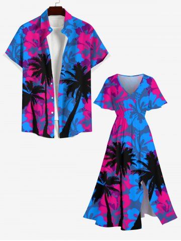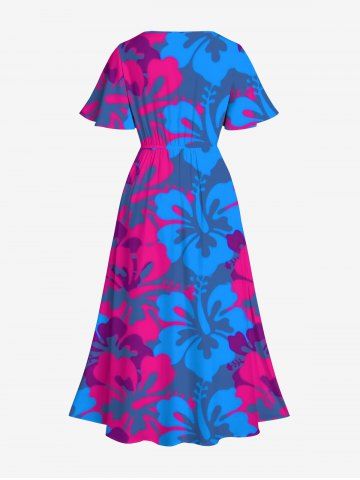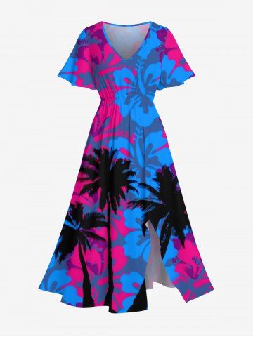 Plus Size Coconut Tree Floral Print Hawaii Split Pocket A Line Dress - Blue - Xs