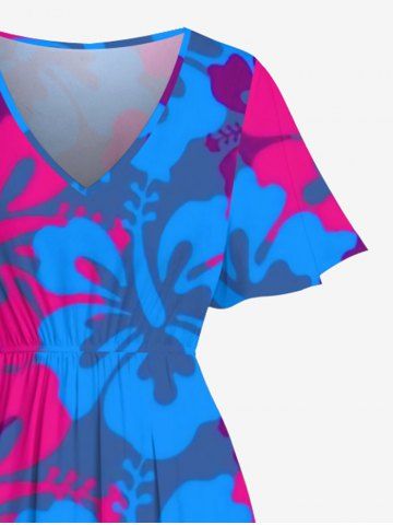 Plus Size Coconut Tree Floral Print Hawaii Split Pocket A Line Dress - Blue - 2x