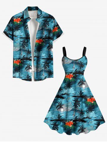 Graphic Dresses > Plus Size Coconut Tree Floral Sea Wave Seascape Print Hawaii A Line Tank Dress